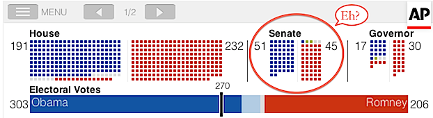 Clearly the reds beat the blues in the senate, their column is longer. Except the numbers say the left side has 51, so maybe the blues won. And why is there a blue hiding in the red column with the pales and the zinc chromate green party? And there are only 50 dots on the blue side, not 51.